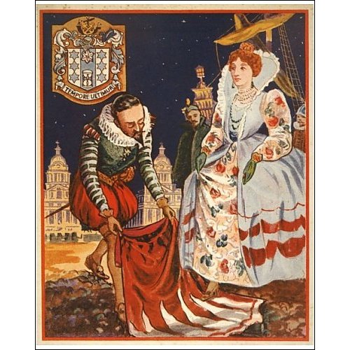 Captain Raleigh found the Queen walking, till meeting with a plashy place, she seemed to scruple going thereon. Presently Raleigh, though his clothes were then a considerable part of his esate, cast and spread his new cloak on the ground; whereon the Queen trod gently, rewarding him afterwards with many suits…