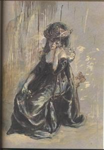 …on a noble charger, with a general’s truncheon in her hand, a corselet of polished steel laced over her magnificent apparel, and a page in attendance bearing her white-plumed helmet. She rode bare-headed from rank to rank with a courageous deportment and smiling countenance..’