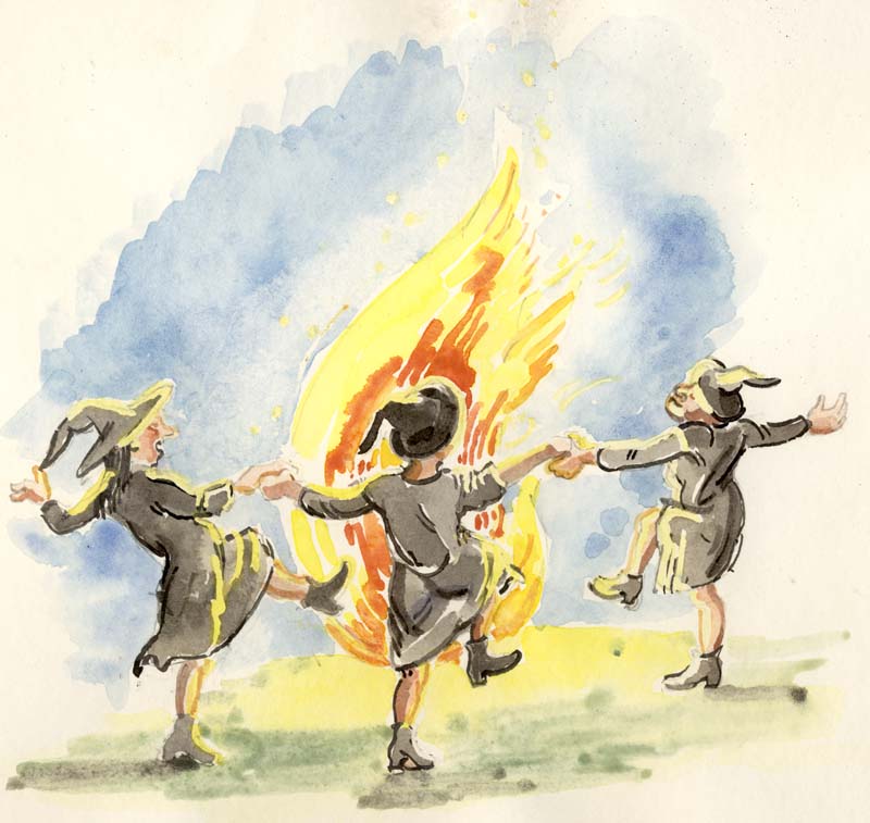 Scholars also assert that the song and dance of the witches in the coven scene are also by ‘another hand’: but as we have seen, when they were questioned by James at Holyrood House, the North Berwick witches performed for the King the reel they had danced at their Hallowe’en Sabbat….