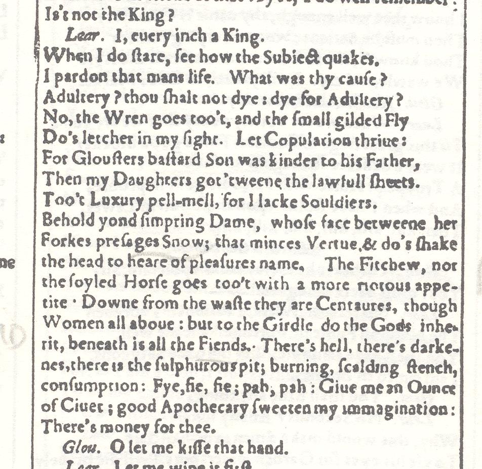 The pirated Quarto edition has supplied us with lines from King Lear…..